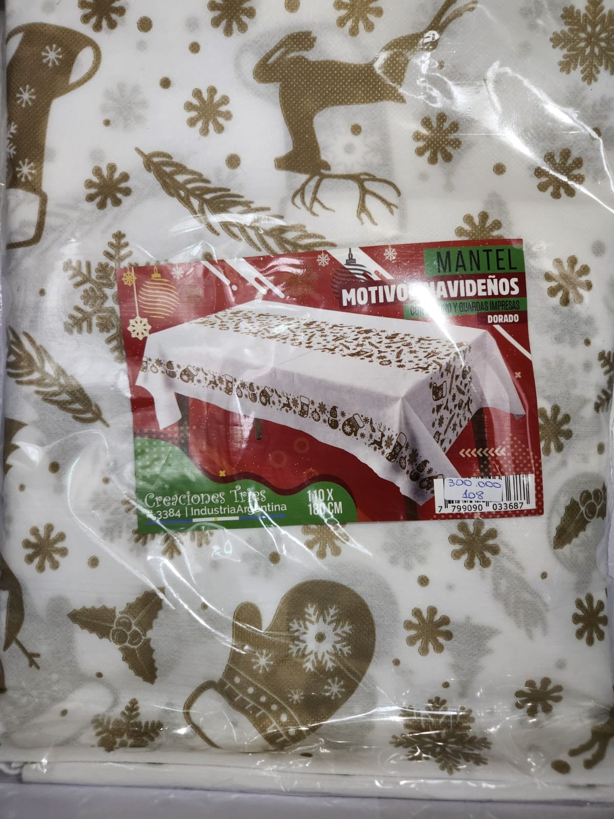 Haz que tus celebraciones brillen con nuestro mantel con motivos navideños. Su diseño único incluye un camino central y elegantes guardas impresas en dorado que aportan sofisticación y calidez a tus reuniones.