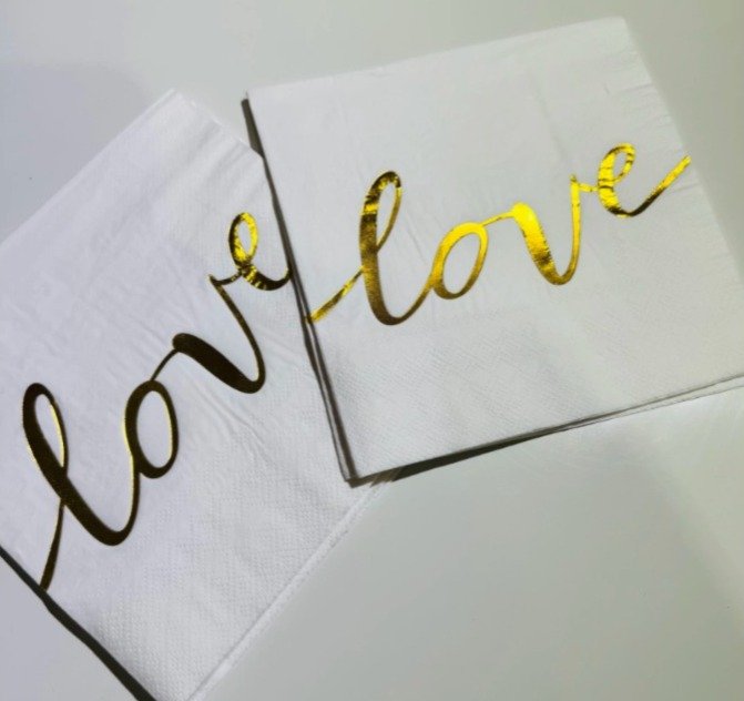 Dale un toque de sofisticación a tus celebraciones con nuestras servilletas con estampado dorado LOVE. Perfectas para bodas, aniversarios, cumpleaños, o cualquier ocasión que merezca un toque extra de elegancia.