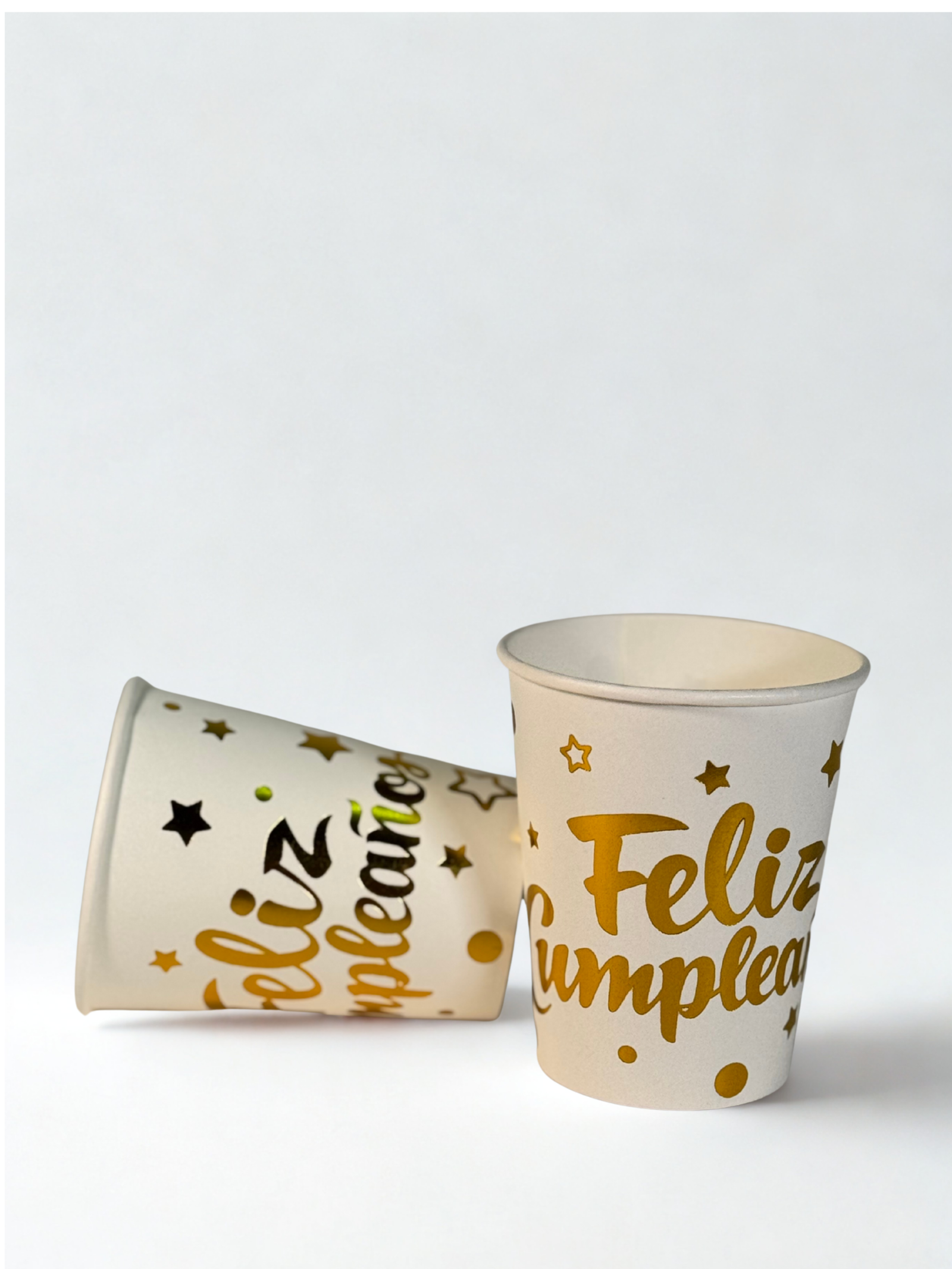 Anima tu fiesta de cumpleaños con nuestros hermosos vasos blancos estampados con ‘Feliz Cumpleaños’ en elegantes colores dorado o plateado. Fabricados con polipapel de alta calidad, estos vasos combinan estilo, practicidad y durabilidad.